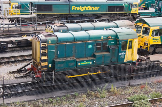 Freightliner liveried 08624 on the end of a rake of flats, at Southampton Maritime