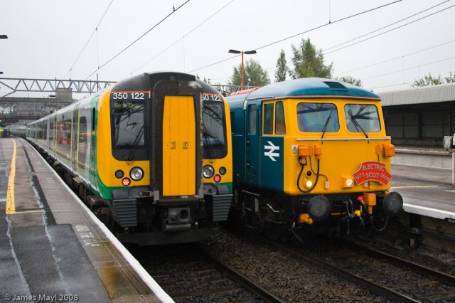 Old and new pass each other at Stafford; 87002 heading for Glasgow, and 350122 for Birmingham