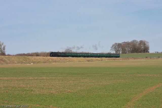 60019 'Bittern' rolls down the grade with an Alresford bound service
