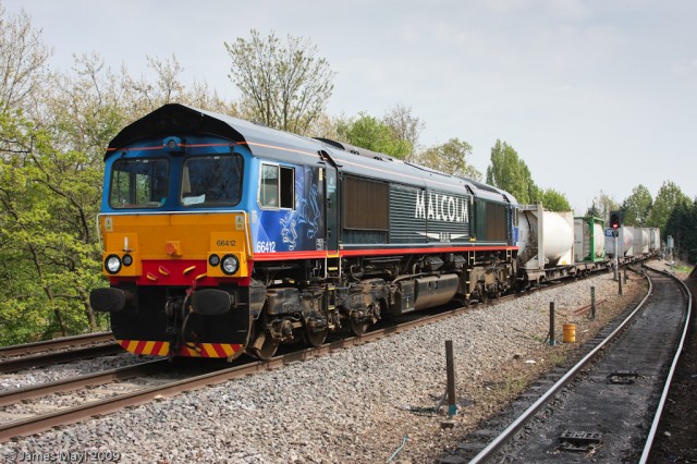 Malcolm Rail liveried 66412 pulls away from a signal check at Gospel Oak, with the 4M71 Tilbury to Daventry sugar train