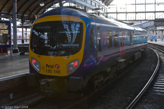 Transpennine Express operated Desiro 185146 stands in the bay platforms at Newcastle, after arrival from Manchester Airport