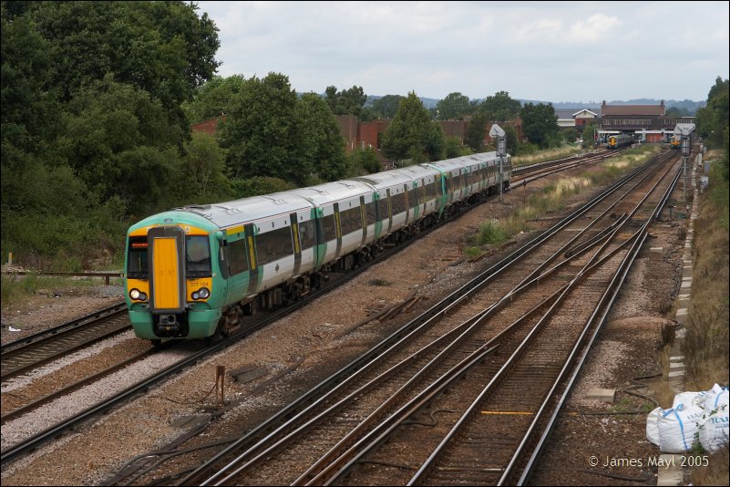 377164 slows for the stop at Gatwick, as it passes Horley - 28th July 2005