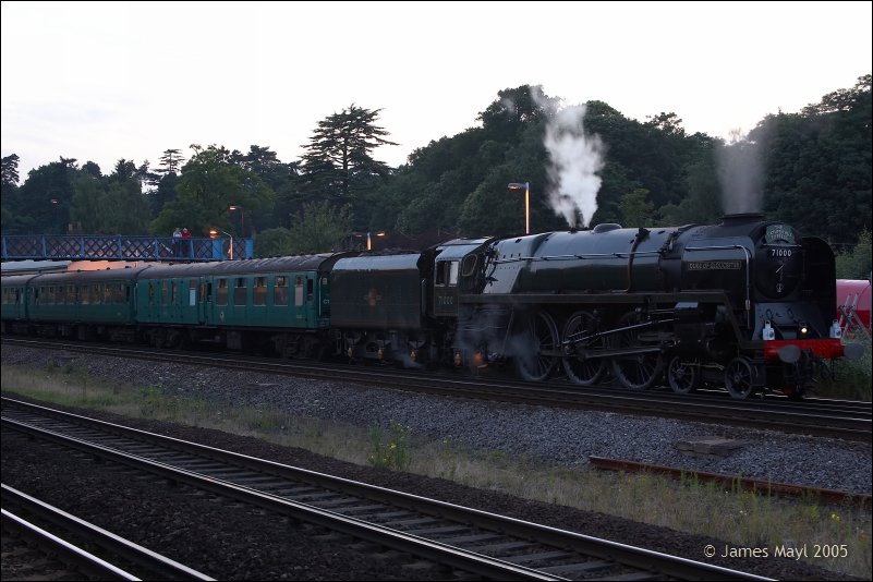 71000 sits with its train at Winchfield during the water stop - 9th July 2005