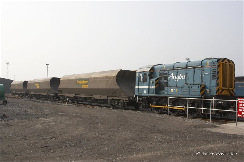 Anglia liveried 08810 coupled to some Freightliner Heavy-Haul coal hoppers - 2nd April 2005