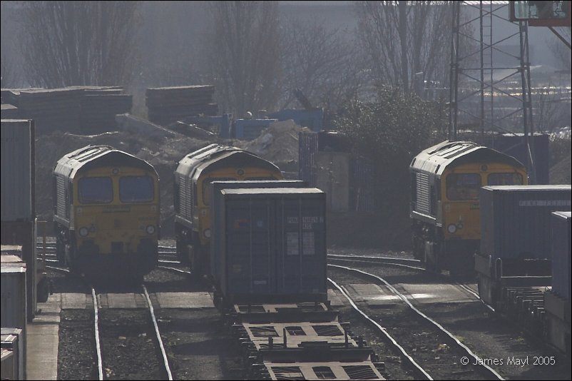 66543, 66572 and 66568 at the London end of Maritime container terminal - 26th March 2005