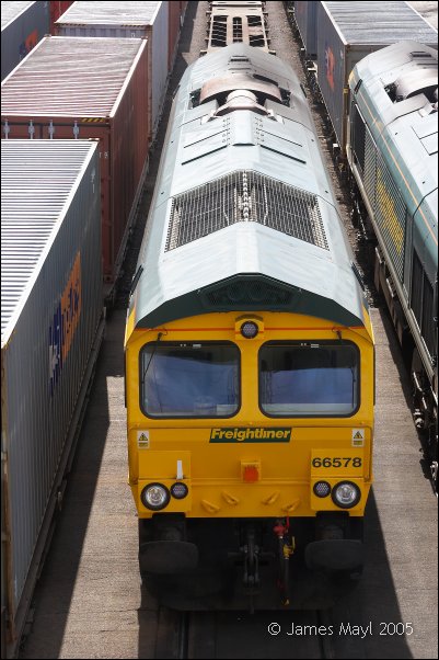 66578 stands at the head of a train, in Maritime container terminal - 22nd May 2005