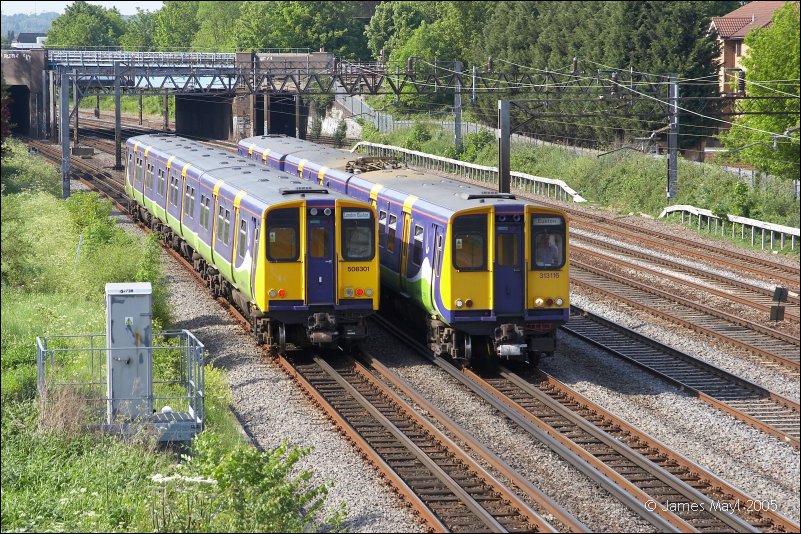 508301 and 313116 pass near South Kenton - 27th May 2005