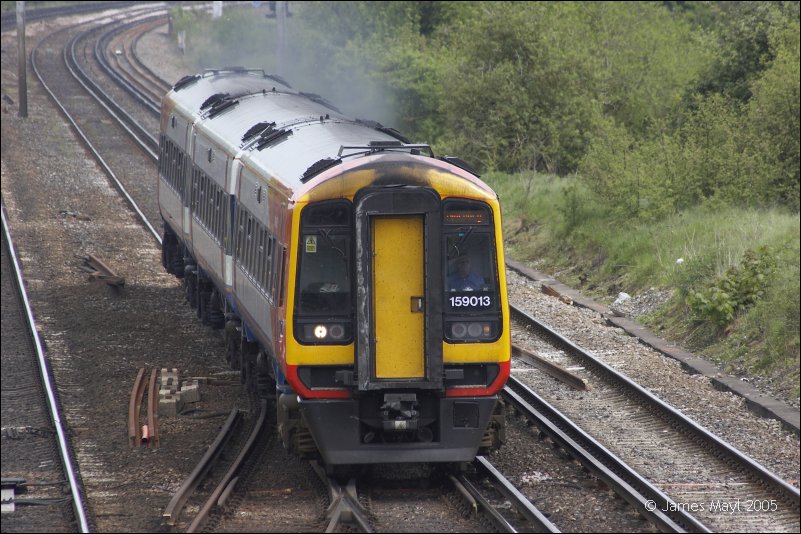 159013 accelerates hard past Worting Junction, leaving a trail of exhaust - 5th May 2005