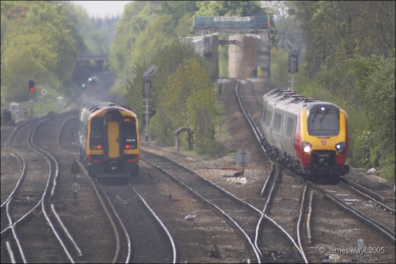 159013 and 221130 pass each other at Worting Junction - 5th May 2005