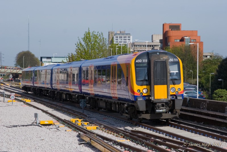450111 arrives at Basingstoke with a terminating service - 17th April 2007