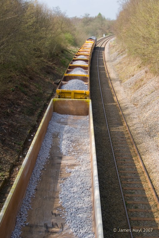 A view down into the Metronet JNA hoppers, showing the surprising amount of ballast that remains in a number of wagons - 9th April 2007