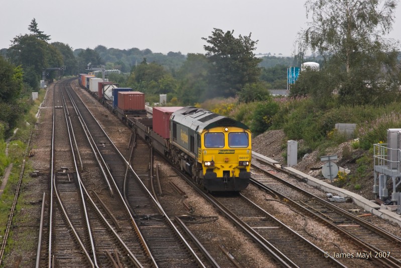 66517 passes Worting Junction with a late running 4O51 Wentloog to Southampton Freightliner - 21st August 2007