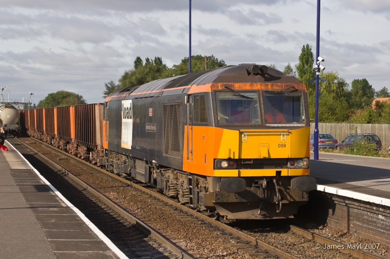 After a quick run up the platform to avoid being bowled by 6N04, Loadhaul liveried 60059 runs the 6K22 Santon to Immingham empty ore working past Barnetby - 31st August 2007