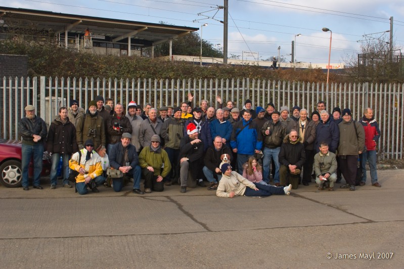 Members of FreightMaster Interactive, and the Wilesden and North Kenton Elite Railway Society gather in the car-park for a group photo - 18th December 2007