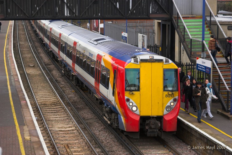 Juniper 8013 stands at Egham with a Waterloo to Reading service - 1st February 2007