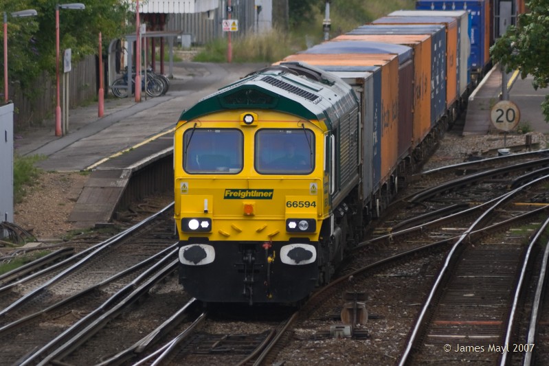 Still with shiny buffers, 66594 speeds south through St. Denys - 6th July 2007
