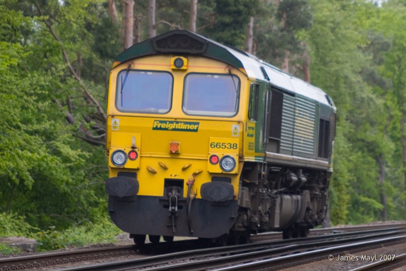66538 accelerates past Steventon on its way to rescue a failed 4O14, led by 66535 - 10th May 2007