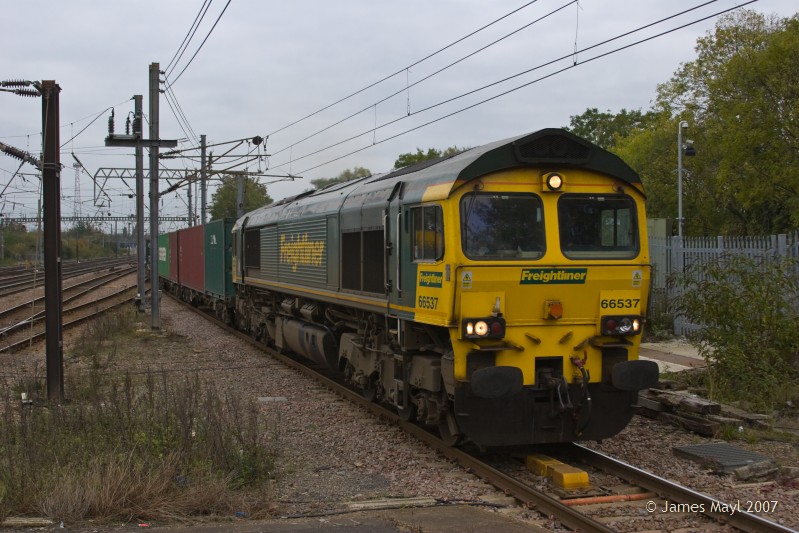 66537 runs through the back of Alexandra Palace and onto the Hertford Loop with the 4E24 Thamesport to Leeds Freightliner - 24th October 2007