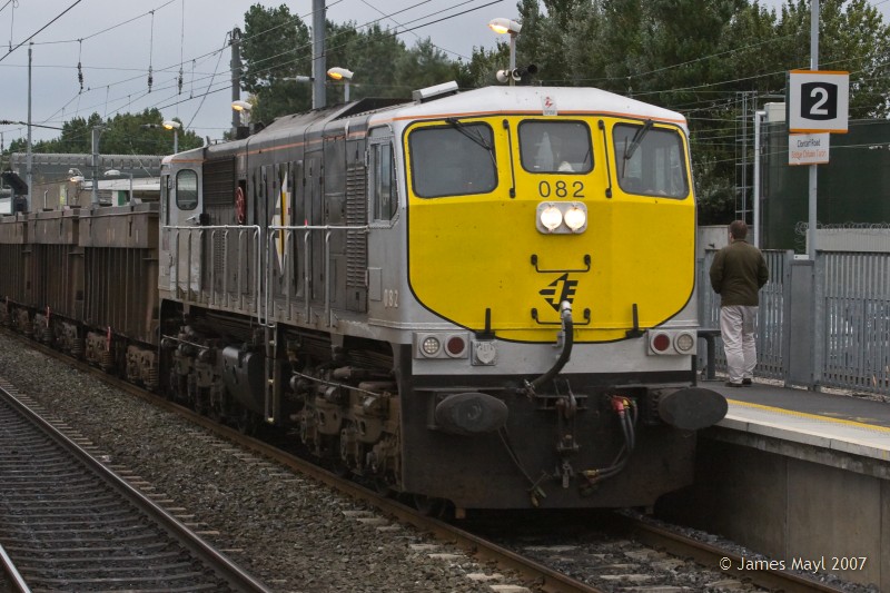 Irish Railways Freight liveried 082 thrashes past Clontarf Road with an Iron Ore train from Dublin Docks - 19th September 2007